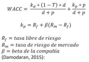 El Costo Promedio del Capital (WACC por sus iniciales en inglés) usado para descontar a valor presente los flujos de caja, se calcula al encontrar el costo promedio ponderado de la deuda kd y el capital Kp: