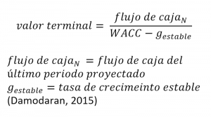 Debido a la imposibilidad de construir un flujo de caja perpetuo, se utiliza el “valor terminal” como un proxy del valor de la compañía a perpetuidad o su valor de liquidación. El modelo de valor terminal con crecimiento estable es el siguiente: